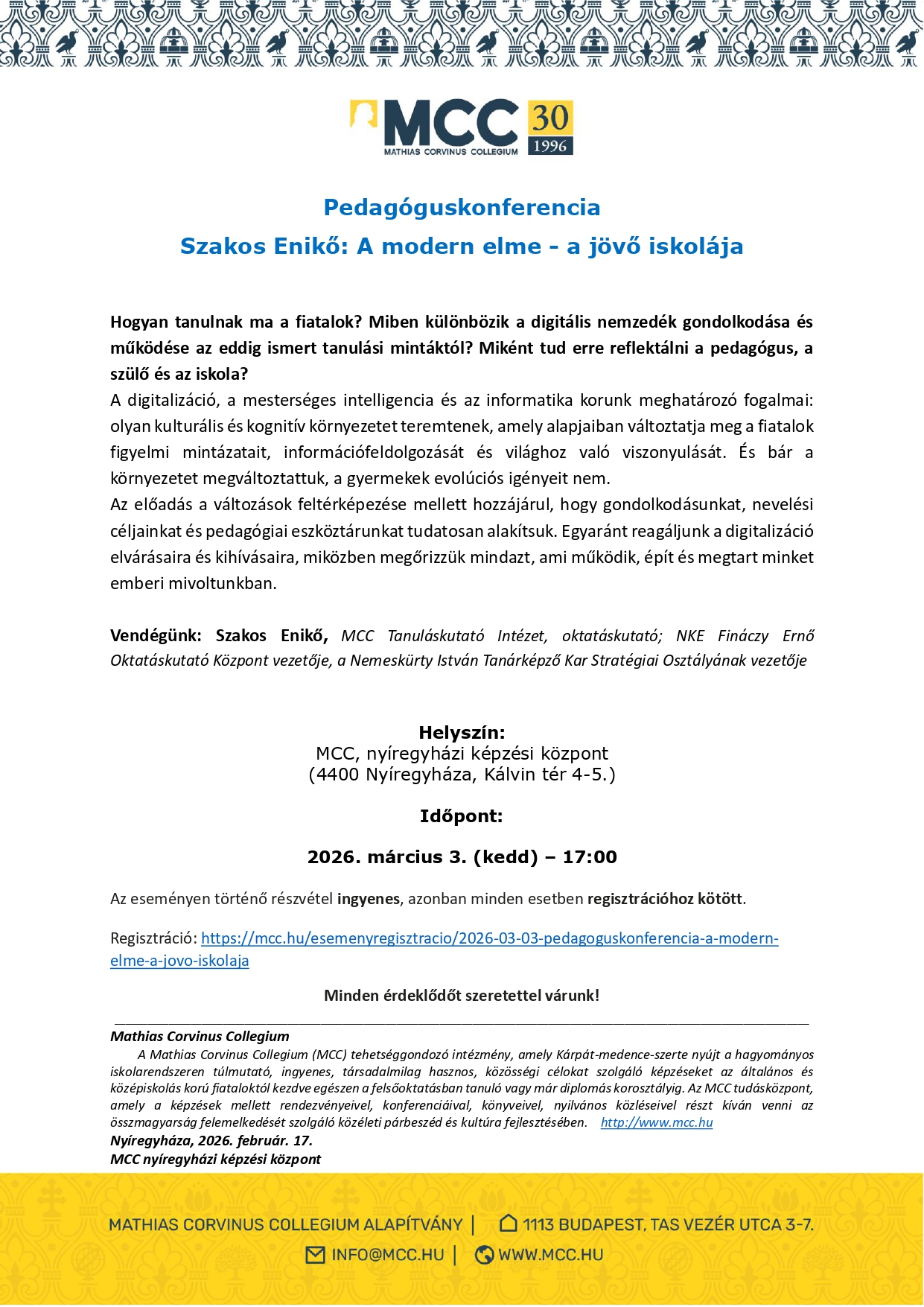 Regisztráció: https://mcc.hu/esemenyregisztracio/2026-03-03-pedagoguskonferencia-a-modern-elme-a-jovo-iskolaja